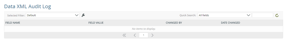 | Data XML Audit Log | Displays data XML audit logs associated to the instance by Field Name, Field Value, Changed By and Date Changed, and is sortable by clicking a column name. The returned logs can be filtered via the Quick Search and by configuring a Selected Filter. |