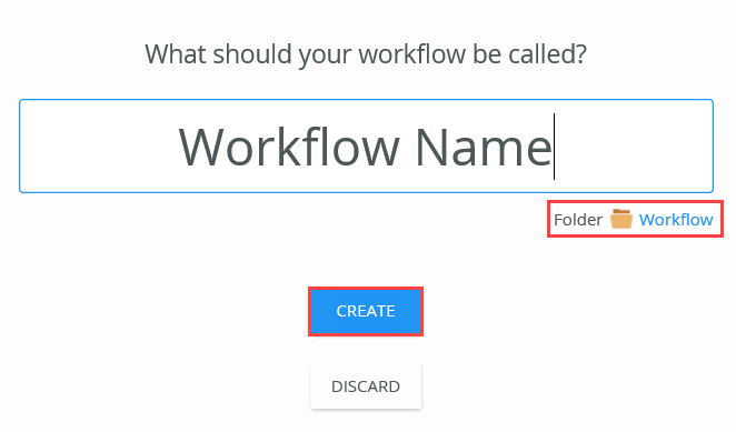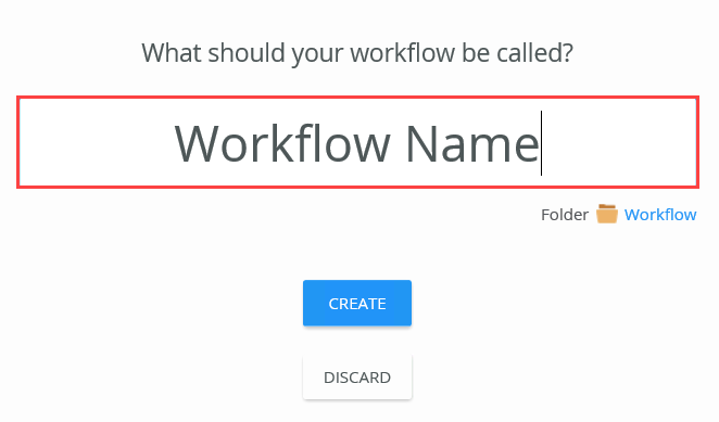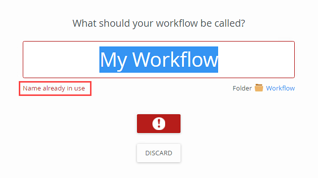- If the workflow name already exists in the selected folder, a warning messages displays Name already in use when clicking the Create button. The Create button stays inactive until a unique name is typed.
