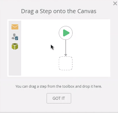 - The Workflow Designer page displays. When you create a workflow for the first time, you see an animated tip. This tip shows you how to drag a step onto the canvas. Click the X to close the tip. If you want to remove the tip, click the Got It button. For more information on how to turn the tip back on, see the Ribbon topic.