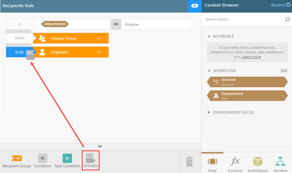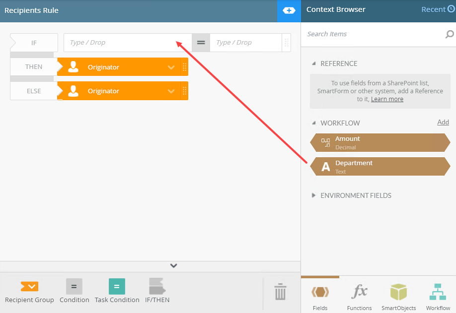 - Click the expand / collapse toggle to expand the Configuration Panel and ensure the Fields tab is selected. For the first part of the rule, type or drag the Department field into the task IF condition.