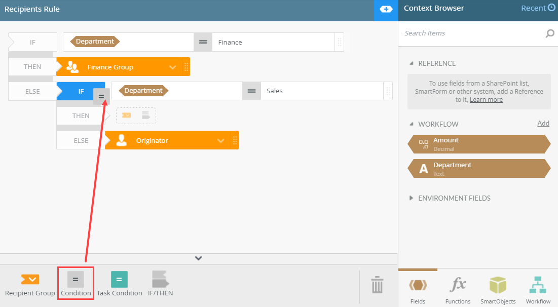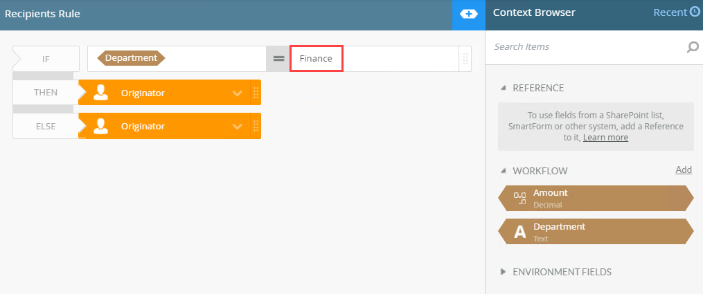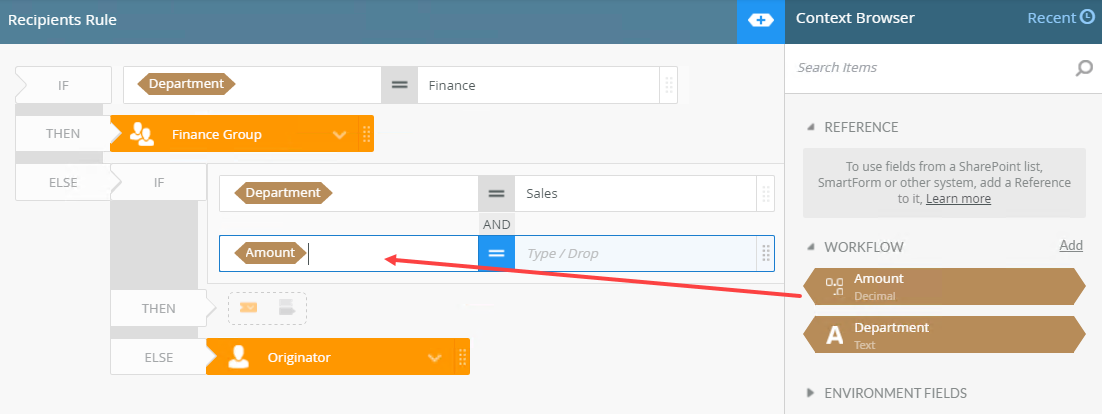- Type or drag a field to specify the condition, in this case if Department is equal to Finance.