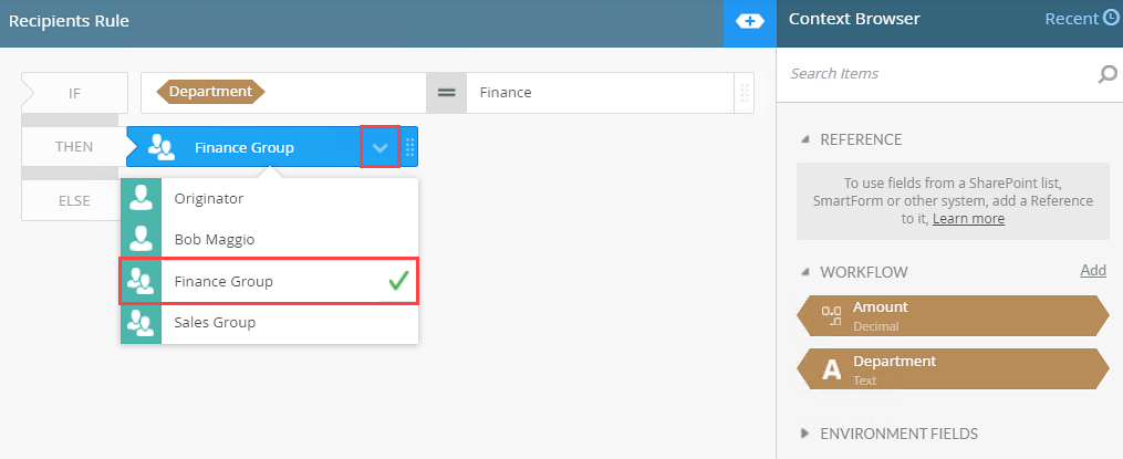- From the recipients menu, because it is a financial task, it is sent to the Finance Group (a recipient group you created earlier that contains the Finance department approvers).