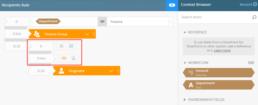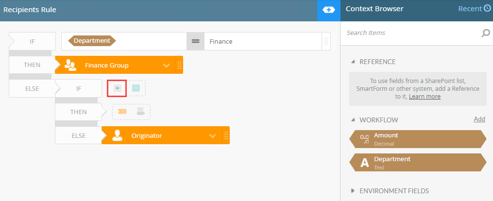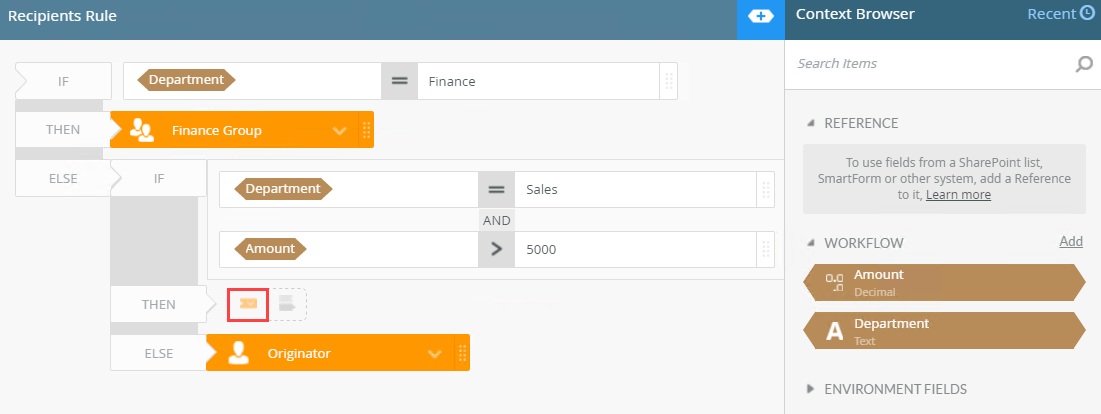 | Recipients Rule | Use this to choose which path is followed. | Select the Certain Recipients, based on a rule option and click the Edit Recipients Rule button. |