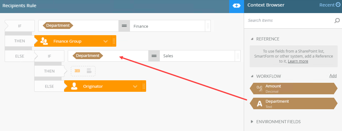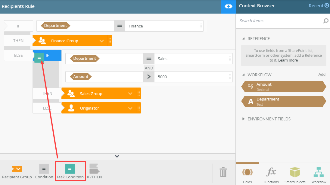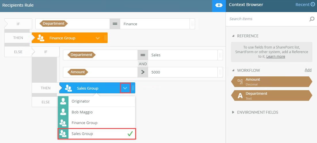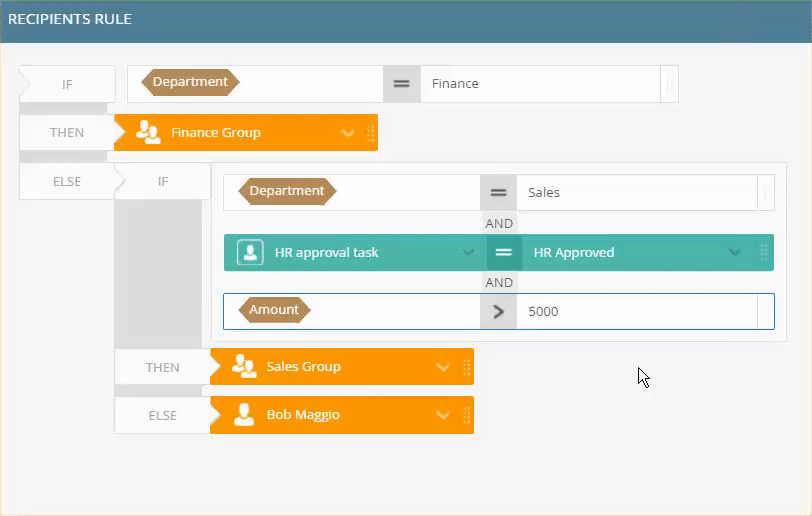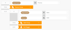 - For this example, accounting tasks should to go to the Finance department, and any task assigned to the Sales department where the amount is more than 5000 should go to the Sales group. All other tasks should go to a particular user.