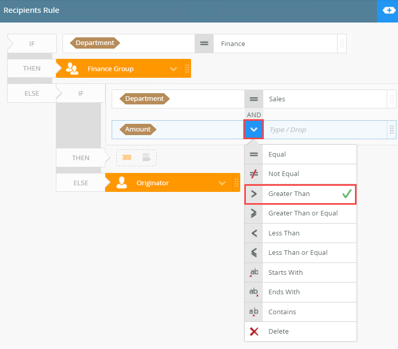 - Click the operator drop-down menu to select a operator for this condition, in this case select > Greater Than to assign the sales tasks with a value of more than 5000.