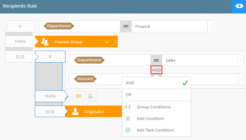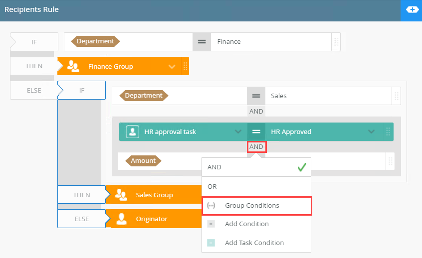 - The second part of building the rule is to add the conditions for the sales tasks. Use a condition block to add the user and amount conditions.
