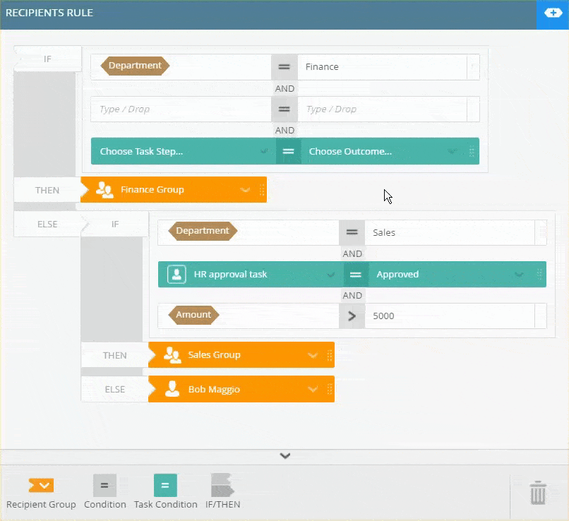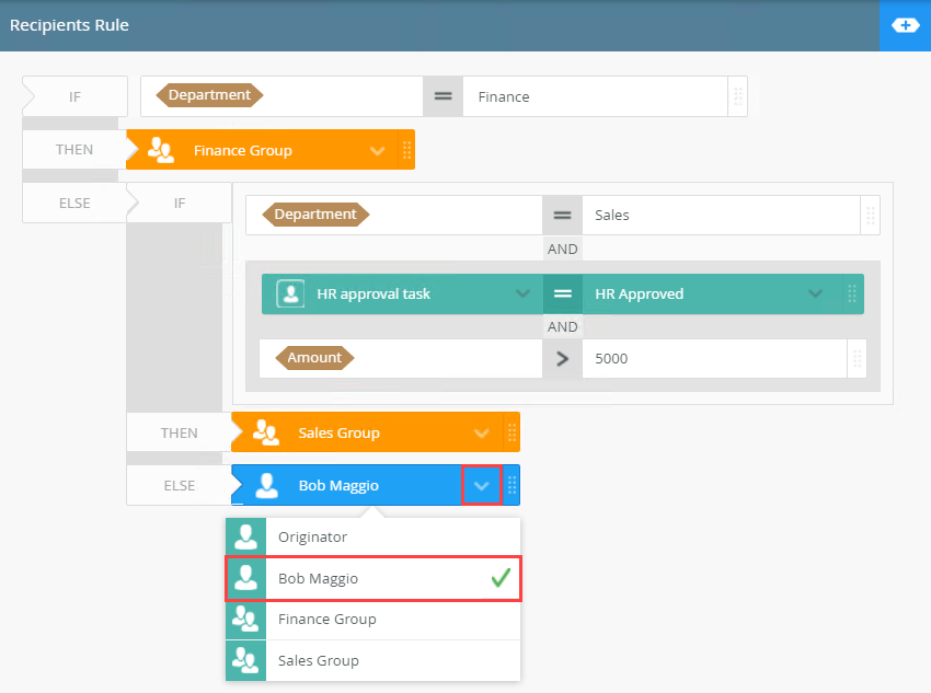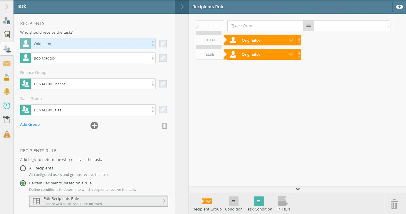 - Your final step of configuring the recipient rule is to specify what happens to the tasks that did not meet the requirements, basically configuring the final Else statement. In this example, all any remaining tasks are sent to Bob. From the recipients menu select Bob Maggio.