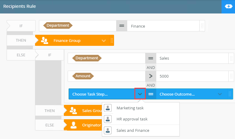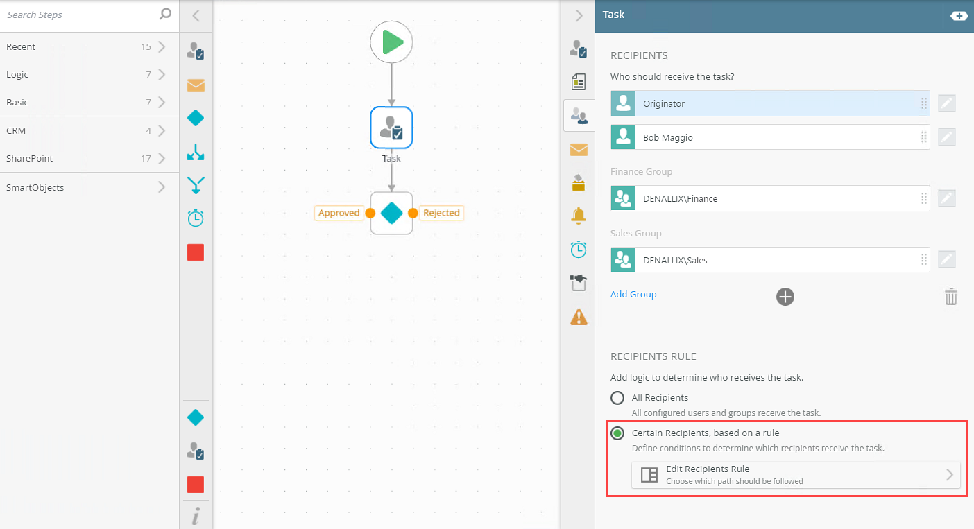 | Recipient Rule | Customize this rule to define conditions to determine which recipients receive the task. This enables you to choose which path is followed. | The rule is located in the Task step on the Recipients tab. |