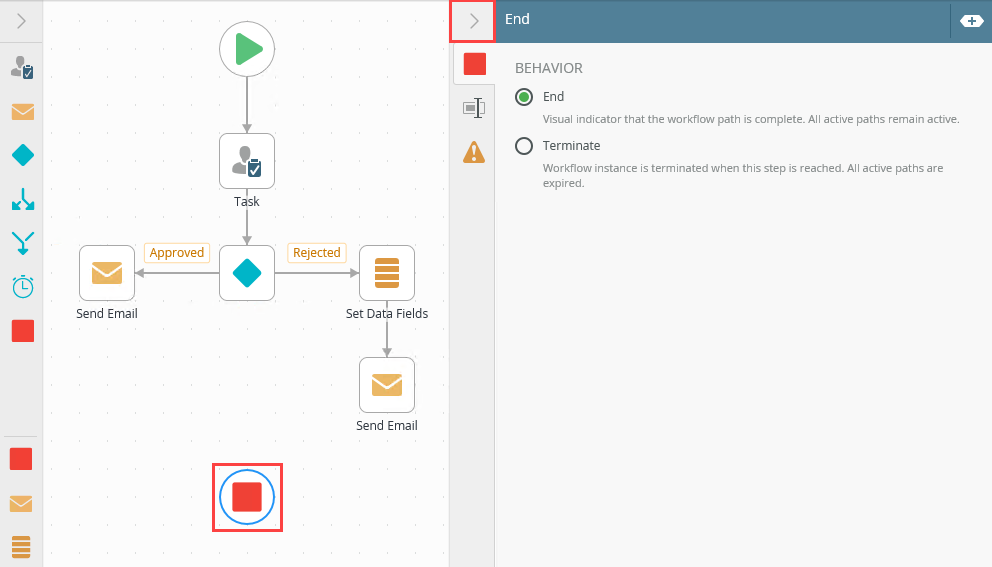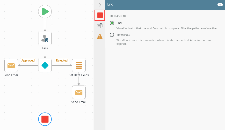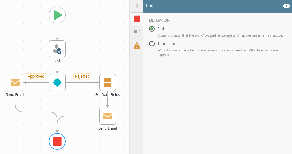 - The End step is, by default, only a visual indicator unless you select the Terminate option, which expires the workflow instance