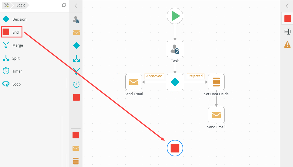 - From the Toolbox click the Logic category, and then click and drag the End step onto the canvas.