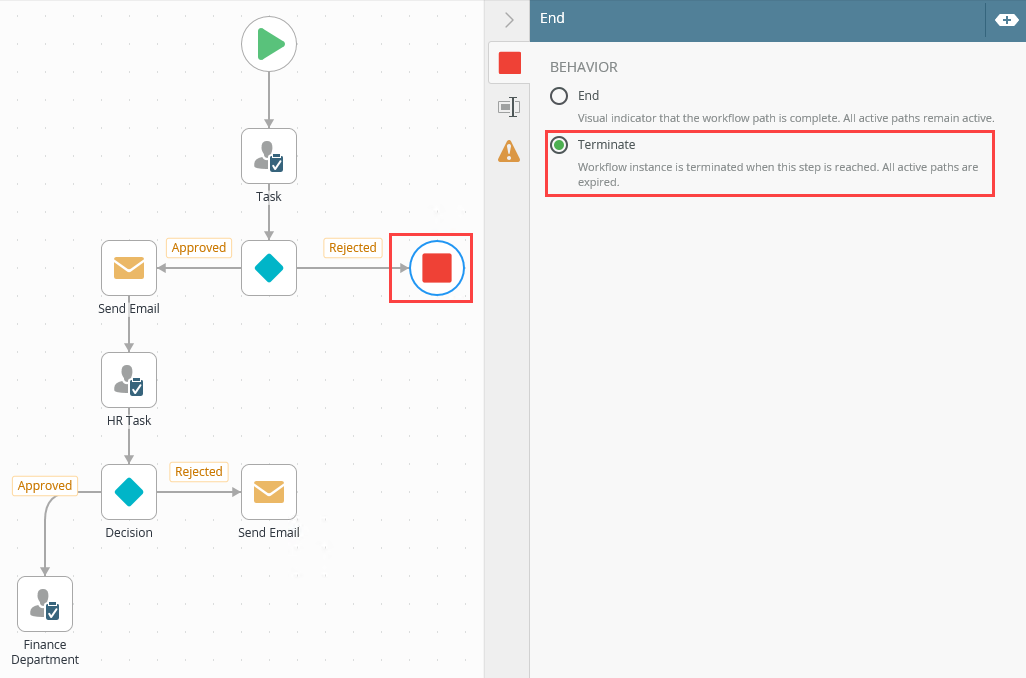 - In this example, the workflow starts with a Manager Approval task. The outcomes are Approved or Rejected. When the manager selects the Approved outcome, the workflow continues. Notice the End step on the Rejected path - it is set to Terminate. This means that when the manager selects the Rejected outcome, the workflow ends. All remaining paths in this workflow terminate and the status of the workflow is set to Terminated.