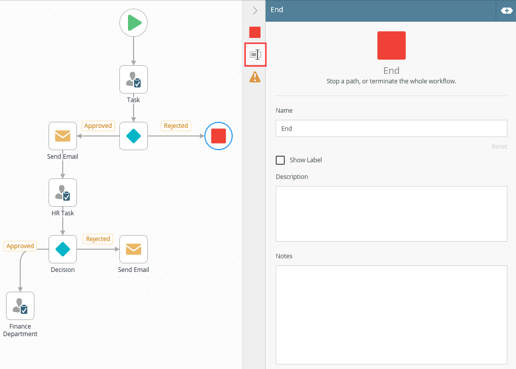 - By default, the End step has no label. To display the label on the canvas check the Show Label check box on the Properties tab.