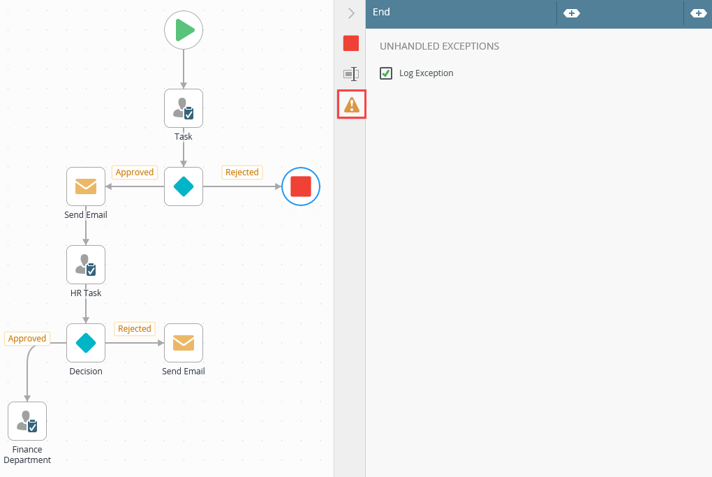 - The exceptions in the table above is an example of those available in Workflow steps. The exceptions available depend on the Workflow step used in the design canvas.