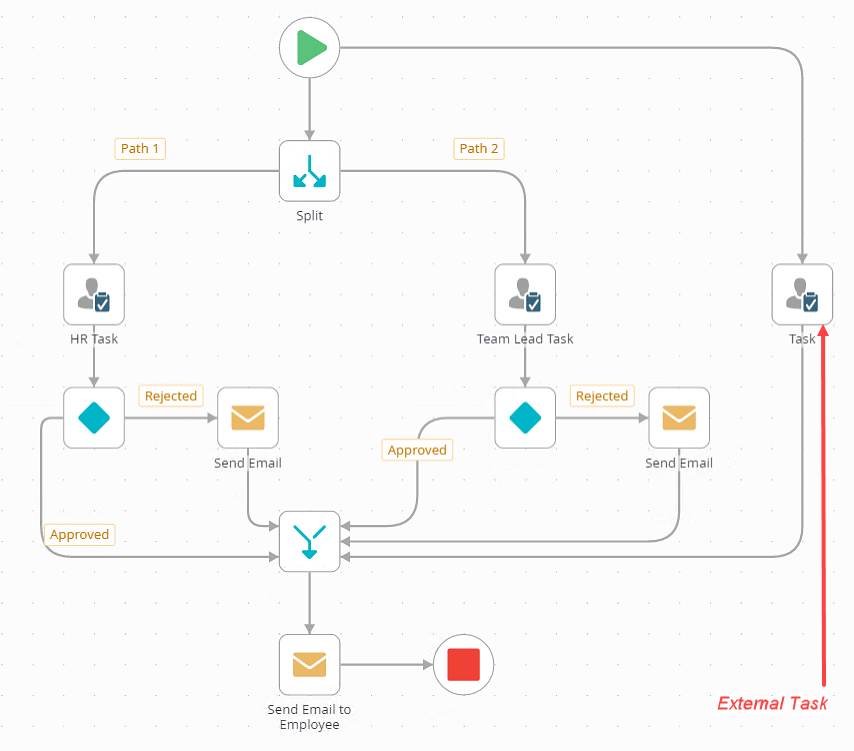 - Any external step or path connected to the Merge step executes and completes. In the example below, an external Task step is connected from the Start to the Merge step. At runtime, this task executes and the work item is added to a recipient's worklist. When it reaches the Merge step this path continues and forms part of the merge process. With the No Logic option selected it means as the HR Task, Team Lead Task and the external Task completes and goes into the Merge Step, the Send Email to Employee step sends the email three times. This results in multiple instances of downstream steps.