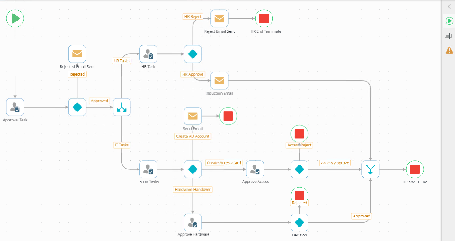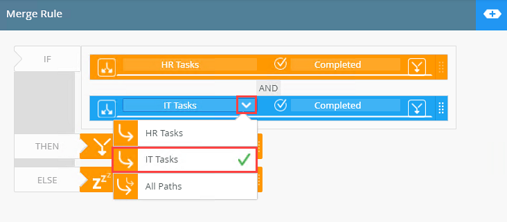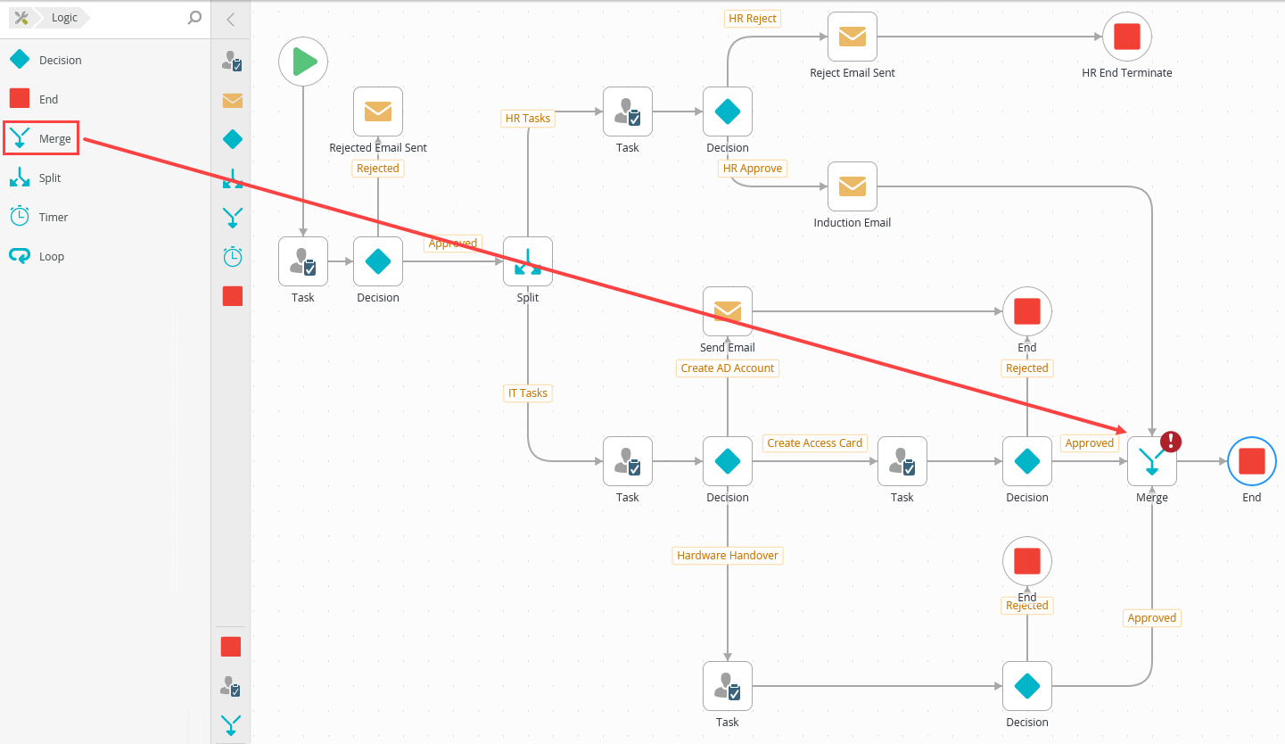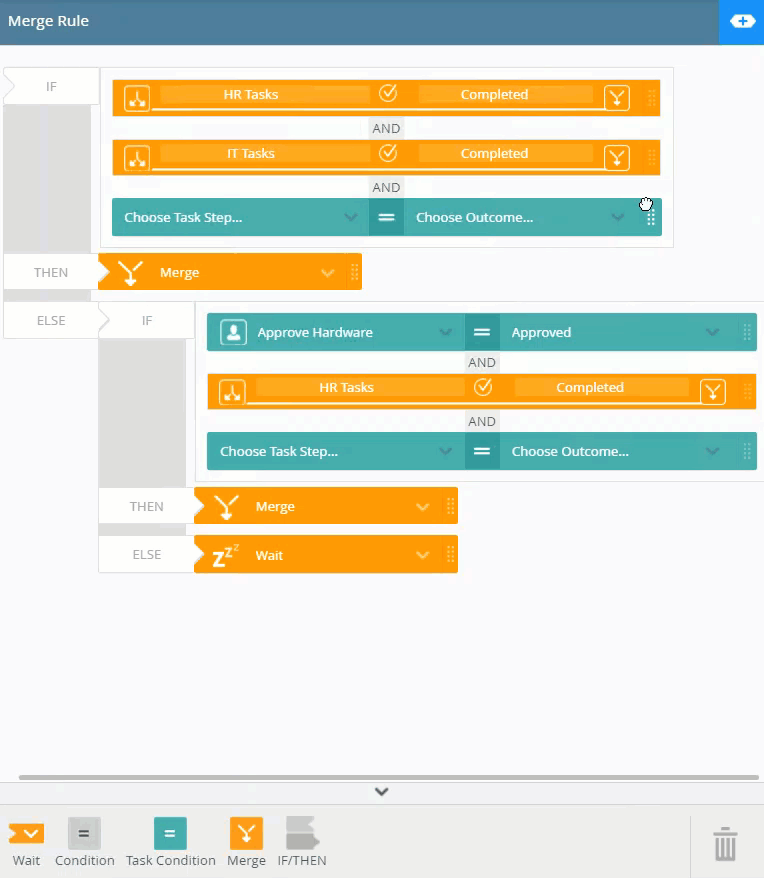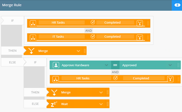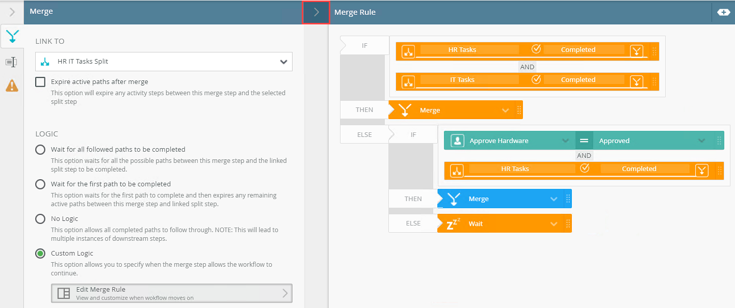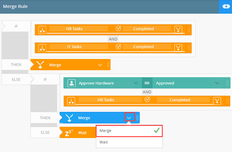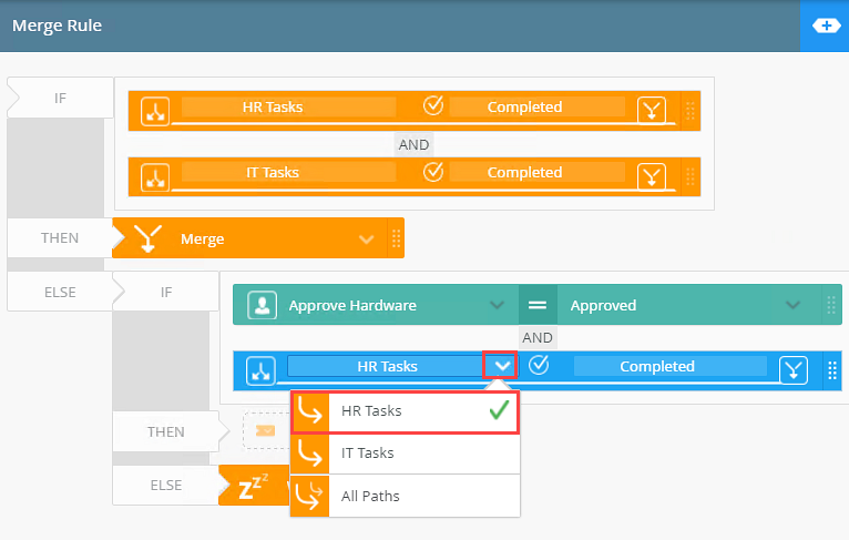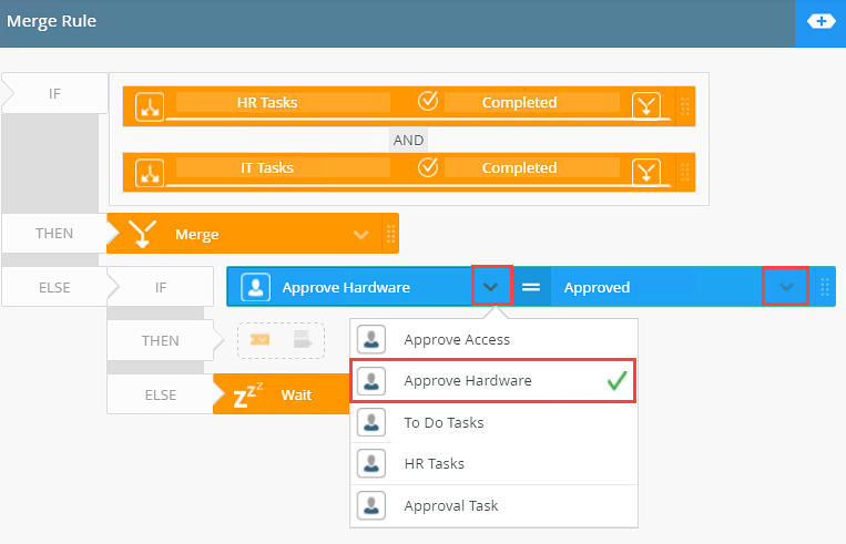 - In the new employee approval example, the merge happens when both the HR and the IT tasks completes or when All HR task and at least the Approve Hardware task completes as approved. This custom rule ensures that even though not all of the IT tasks complete, the merge happens if all HR tasks and one of the IT tasks (Hardware Handover) complete.