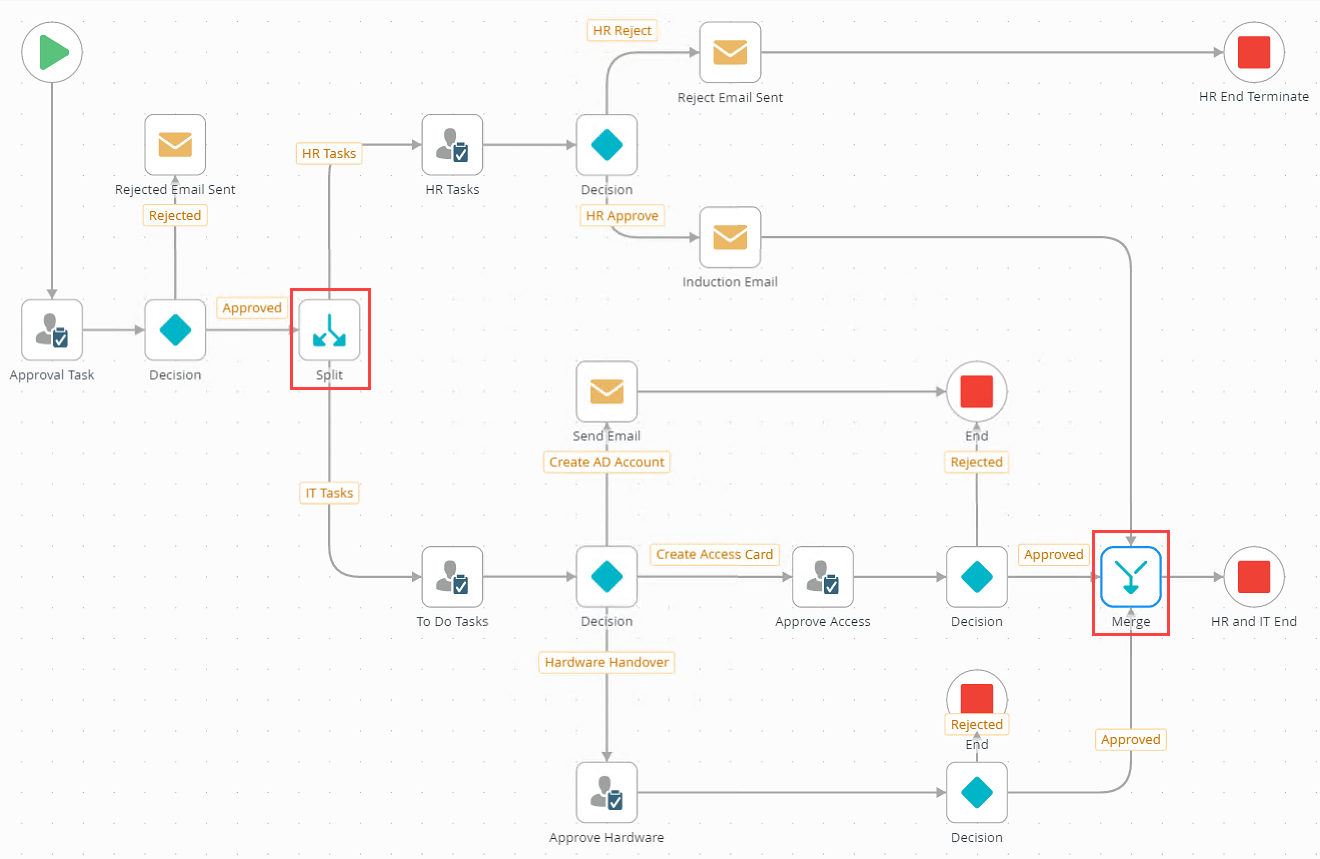 - In the New Employee Approval workflow example, the workflow waits until both HR and IT tasks complete and then merges.