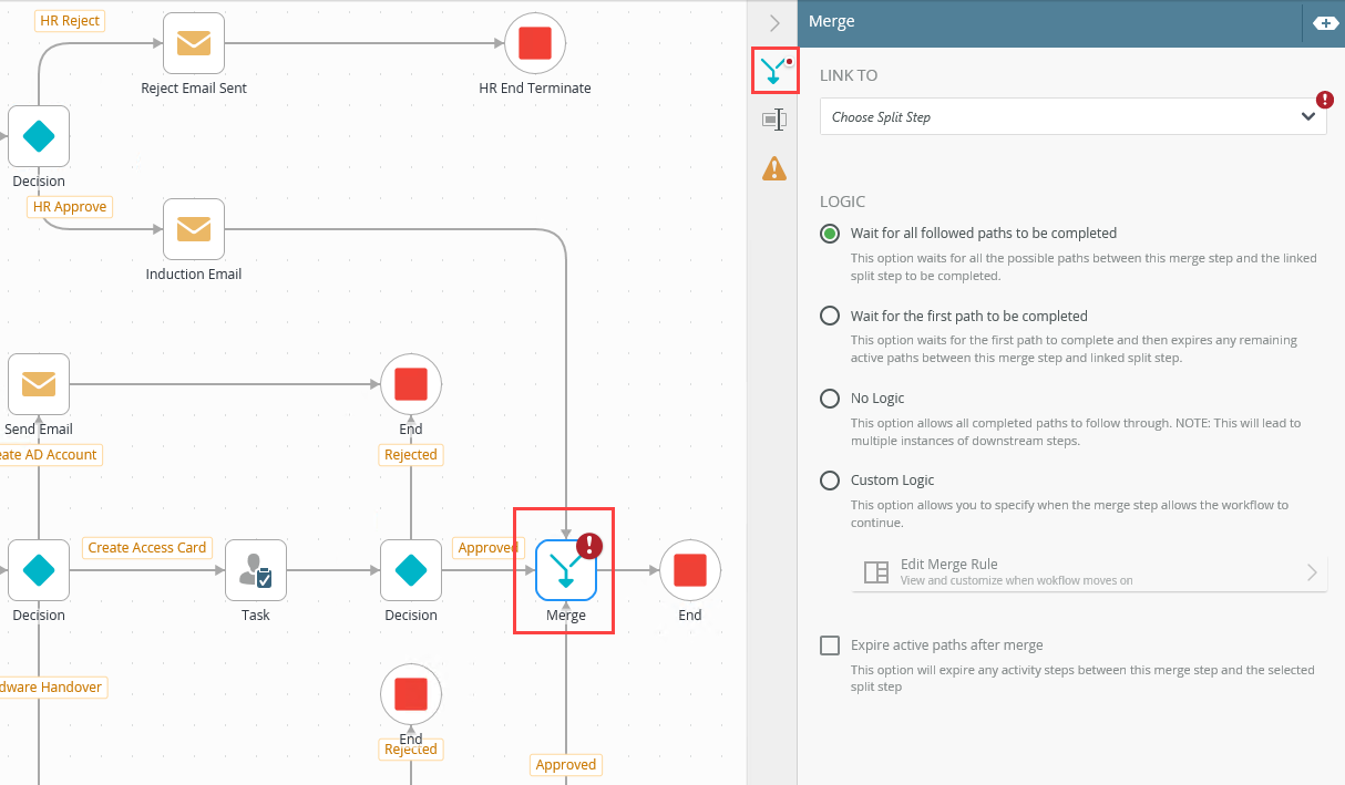 - In the New Employee Approval workflow example, the Merge step doesn't consider any logic, and all paths connected to the Merge step completes and none expires.