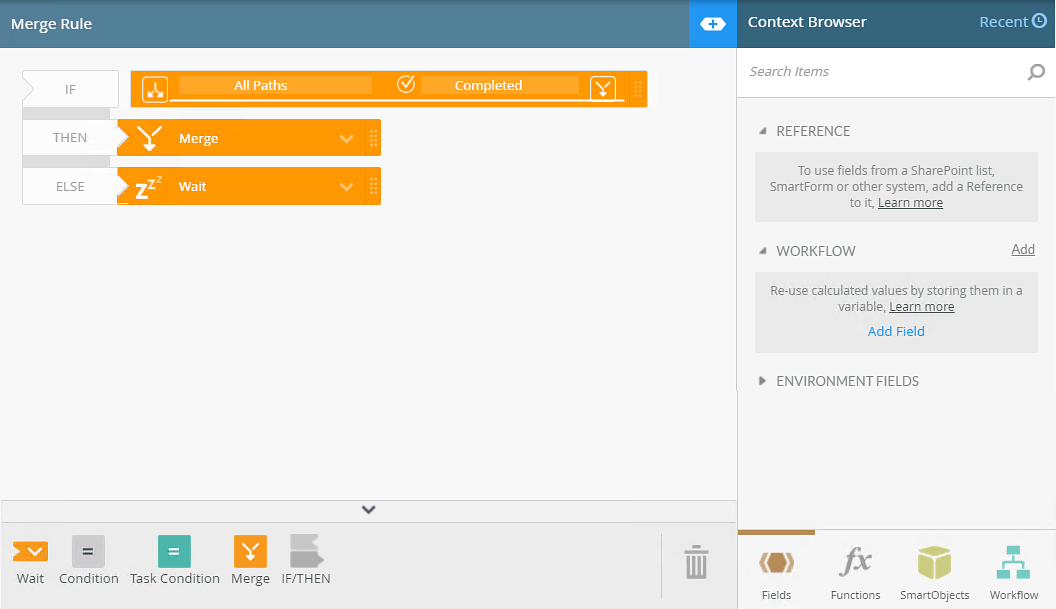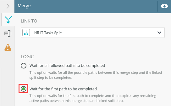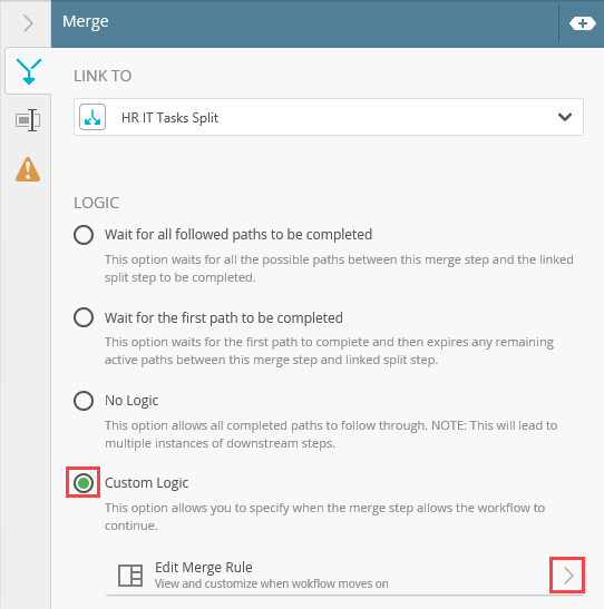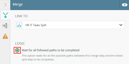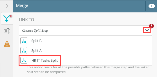 Use the Merge step to bring parallel paths within the workflow back together into a single path. A Merge step has to link to a Split step within the workflow. This is a prerequisite when adding a Merge step. This step is also a quick way to identify where parallel paths converge in the workflow diagram. You decide when a Merge step can move on by customizing rules around the Merge step in order to suit your business requirements.