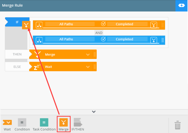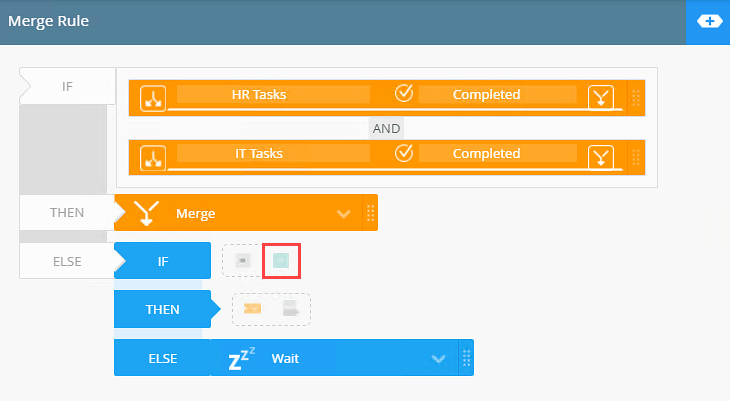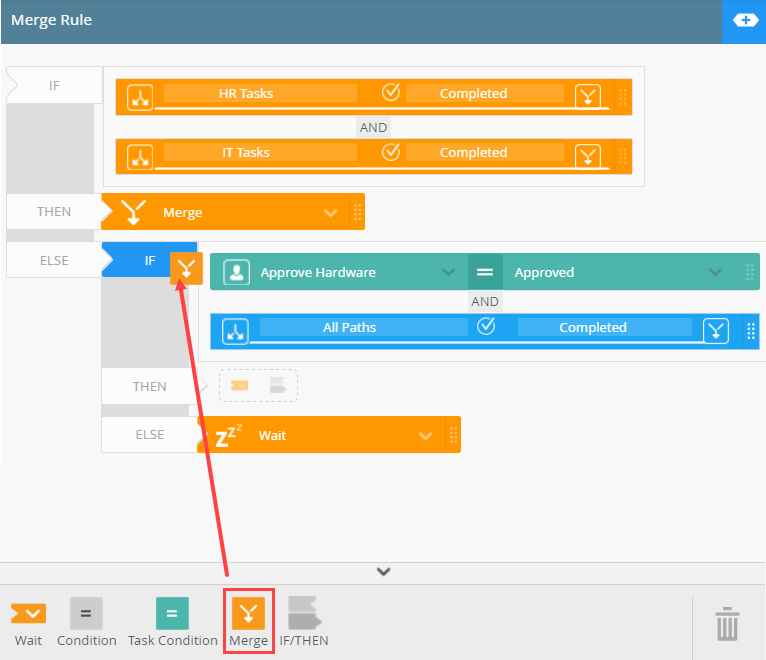 - To cater for the All HR paths to be completed part you must add a merge condition. To add an additional Merge condition to the rule, click and drag a Merge condition onto the IF block from the Rules Toolbar.