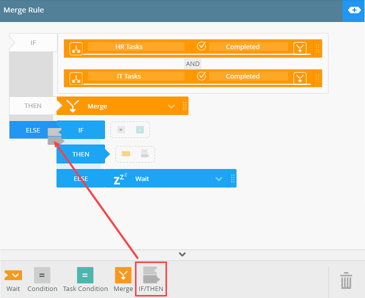 - To cater for the second part of the custom rule add an IF condition. This adds an area to build the All HR tasks completed and the Approve Hardware task has been approved part of the rule. To add an additional IF condition to the rule, click and drag an IF/THEN condition onto the ELSE block from the Rules Toolbar.