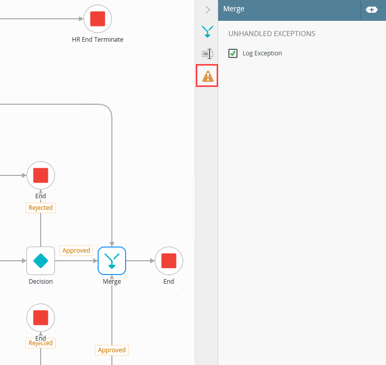 - The exceptions in the table above is an example of those available in Workflow steps. The exceptions available depend on the Workflow step used in the design canvas.
