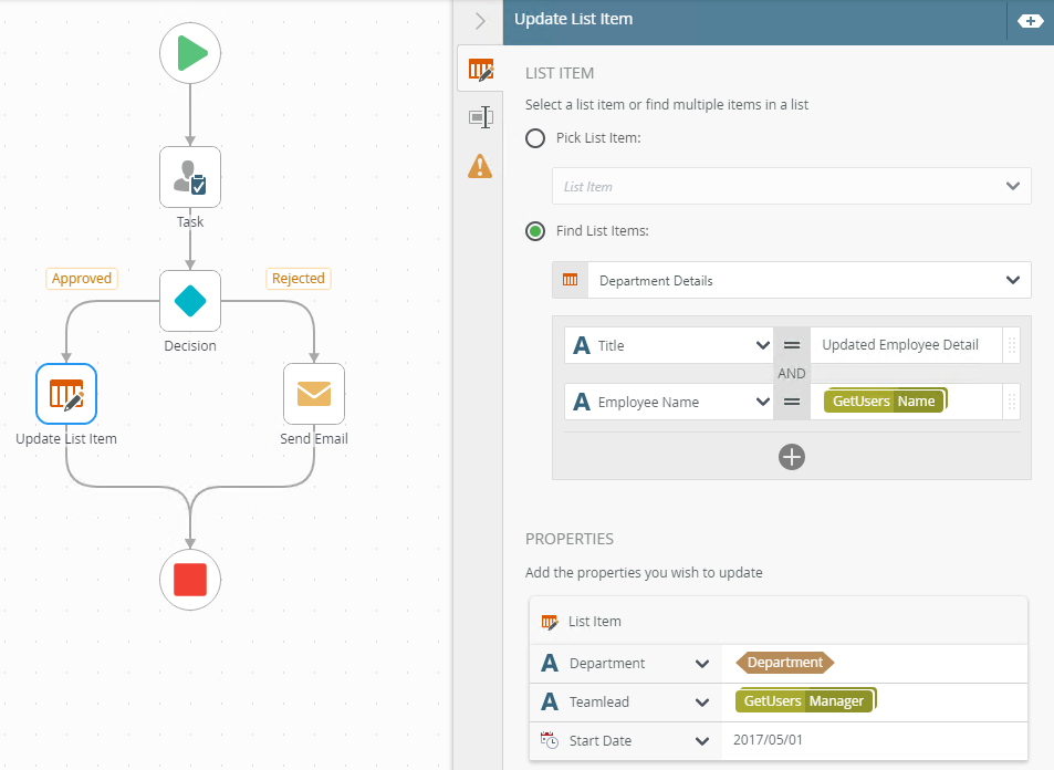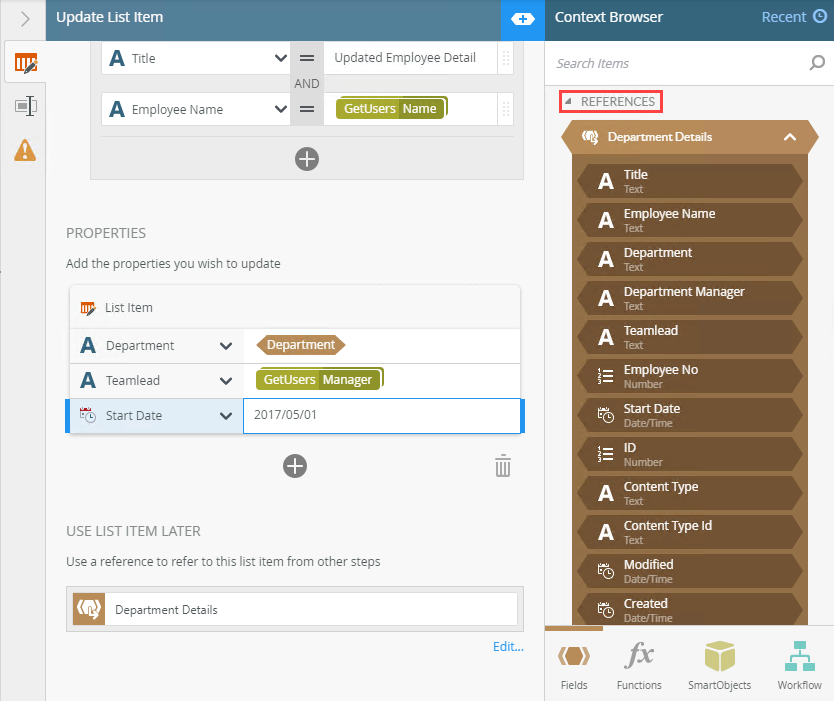 Example of an Update List Item step in a workflow
