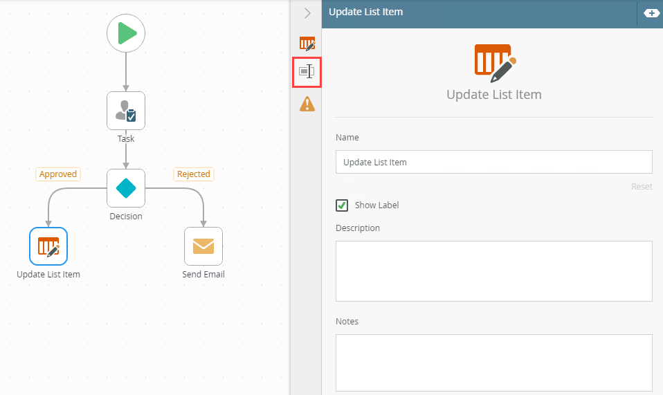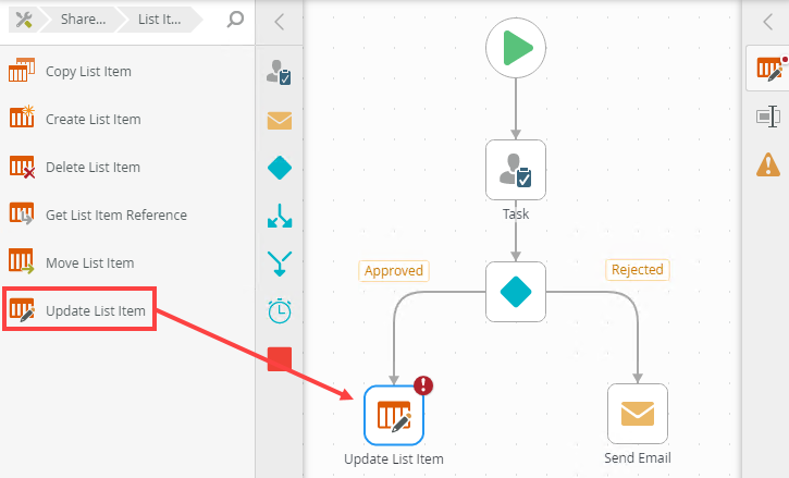 Use the Update List Item step to update a SharePoint list item. You can, for example, use the Update List Item step in a workflow to update a list item's status based on an approval step outcome.