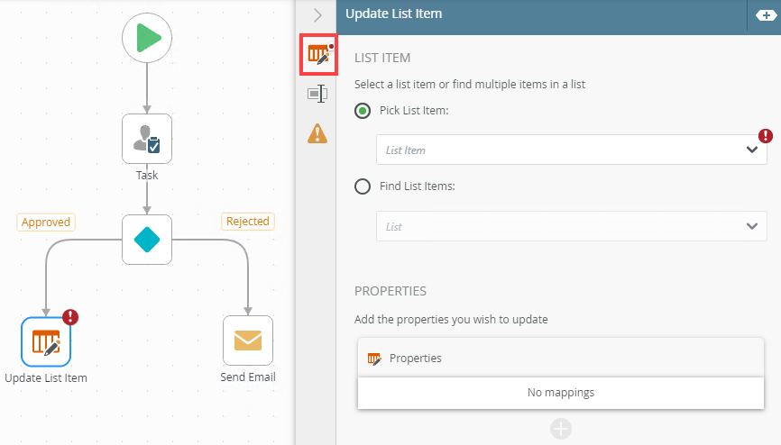- Select the Update List Item tab. Use this tab to configure the list properties.