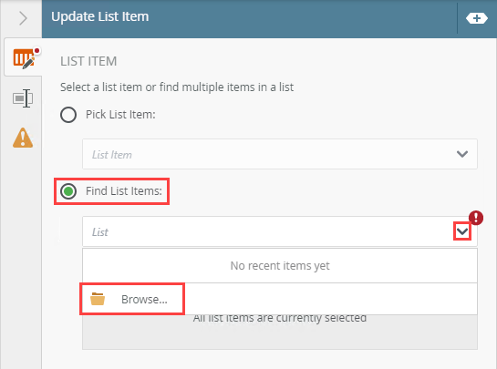 For this example, select Find List Items. From the drop-down menu select Browse and navigate to a list to update the list item.