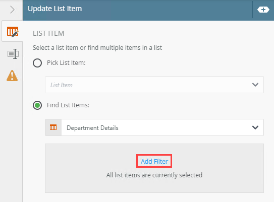 | Find List Items | Use this to browse to the list containing the list item to update. | Click the Find List Item radio button to enable this option. Click the menu and select Browse to browse to a specific list. |