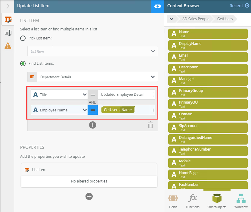 | Properties | Use this to add name and description detail for the list. Type values or create dynamic values by dragging Functions, Fields, SmartObjects and Workflow-related items from the Context Browser into the fields. Note that when a SmartObject Load method property is used, an input property is required for the correct data to load. | Click Add to add a property. Click the menu to select the property. Type values or create dynamic values by dragging Functions, Fields, SmartObjects and Workflow-related items from the Context Browser into the fields. To delete properties, select them and click the Trash bin. |