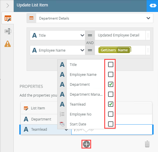 - In the Properties section add fields and values to update the list item with. Click Add.