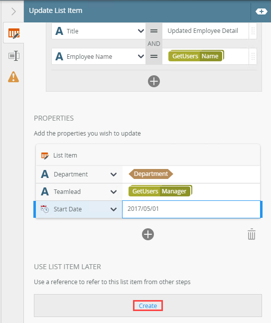 - To create a reference click Create. Reuse this reference in the current step or from another step in your workflow.