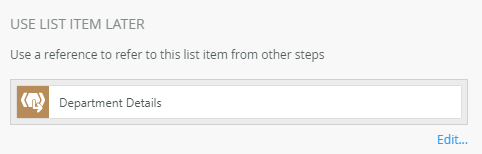 | Use List Item Later | Use this to create a reference to use from other steps within the workflow. A reference can only be created if a reference is NOT consumed. | Click the Create link to create a reference. Click the Edit link to edit the reference name. If you edited the reference name and want to reset it, click the Reset Name link. |