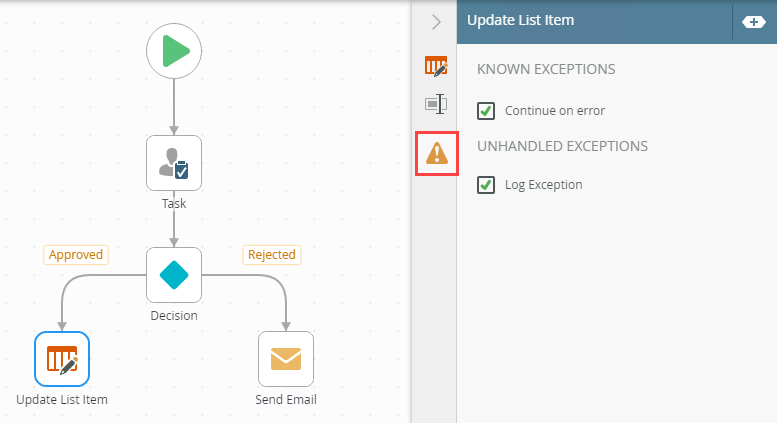 - The exceptions in the table above is an example of those available in Workflow steps. The exceptions available depend on the Workflow step used in the design canvas.