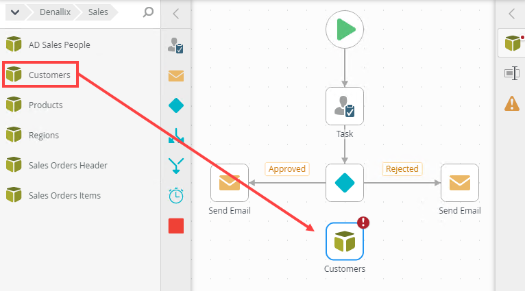 The SmartObjects category in the Toolbox contains Standard SmartObjects and custom SmartObjects. Use SmartObject to apply the available SmartObject methods within a workflow. These SmartObjects are dragged onto the canvas, configured and then forms part of the workflow.