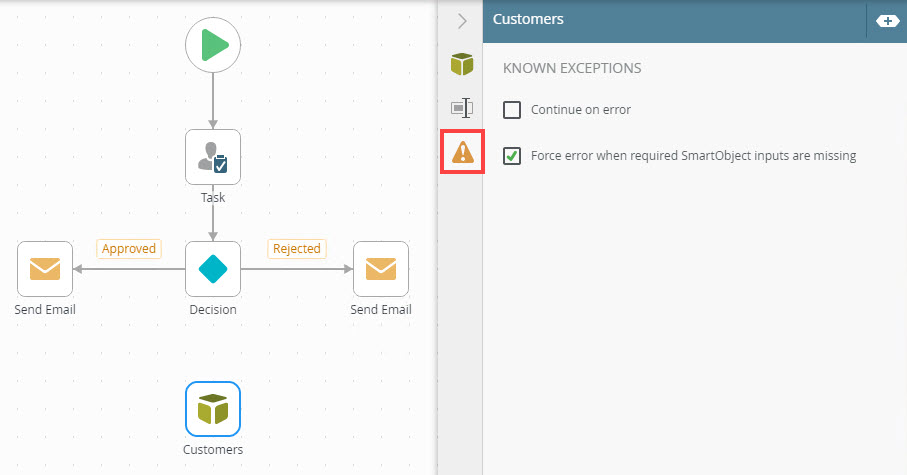 When executing a SmartObject step in a workflow, if the SmartObject's required input fields don't have values, this option specifies whether to continue on to the next step in the workflow, or not. If the error is forced, the workflow instance stops and the following error shows in Management > Workflow Server > Workflows > {workflow name} > Errors tab: "One or more required inputs are missing for the {SmartObject Method} method in the {StepName} step." |
