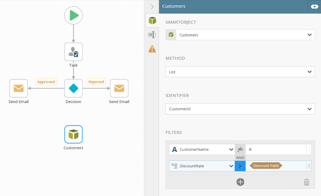 Click the Add Filter link to add filters. Select filter values from the drop-down menu. Click the operator button to select the operator. Click Add to add additional filter properties Type values or create dynamic values by dragging Functions, Fields, SmartObjects and Workflow-related items from the Context Browser into the fields. To delete properties, select them and click the Trash bin. |