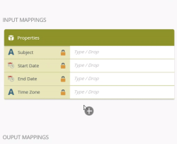 The Input mapping section maps SmartObject input fields to variables. Both input properties and parameters can be required or optional. When you drag a SmartObject onto the canvas and select the method, only required properties show in the Input Mappings section. A lock icon indicates these required properties. You can add additional properties of the SmartObject by clicking the add button and selecting them from the input mapping list as shown here.