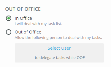 When you are out of the office and need someone else to handle your tasks, select the Out of Office option and choose a person by clicking the Select User link.