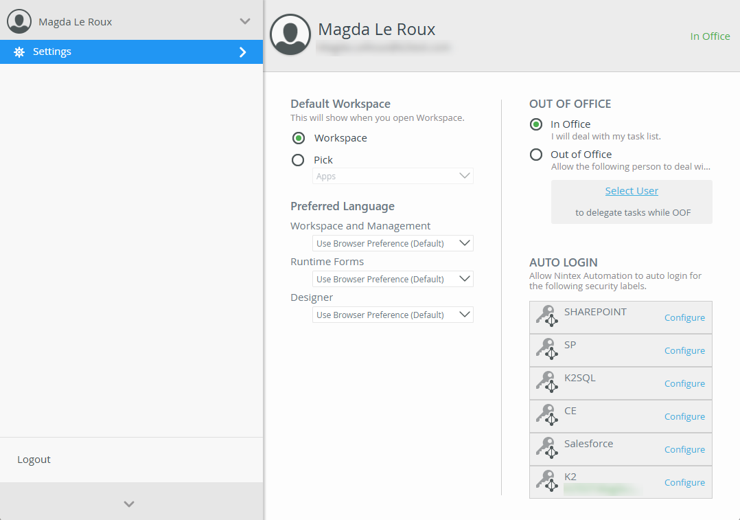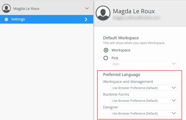 You can specify the preferred language for Workspace, Management, runtime forms and Designer within Workspace. Changing the preferred language of any of these three settings will override the browser language.