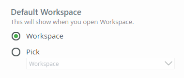 The Workspace (Desktop) site is the default workspace when the product is installed. To configure a different workspace to use, enable the Pick option and select another workspace from the menu. The default workspace can also be changed in Custom Workspaces.