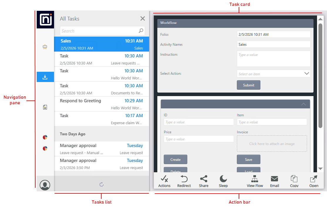 Displays the actions available for the task, such as Approved or Declined, which are defined in the workflow. Click the Show actions while form loads option to see actions while the form loads. Actioning a task via the Task Card removes the task from the Task section, and then loads the next task. If the configured actions can't be actioned without opening the form, they do not appear on the Actions page.