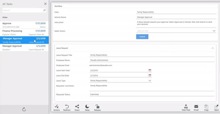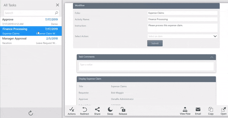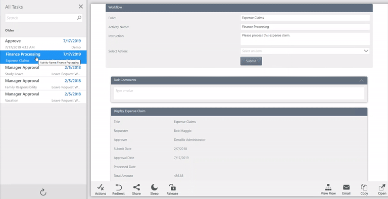 Sends the selected task to another person for completion. Once you redirect a task, it is removed from your task list and appears in the other person's task list. Search for and then select the person that the task is to be sent to, and then click Redirect. The Recent Items list displays your most recently selected users. When you select a person in a search, they are added to the Recent list. See the Redirect topics to redirect tasks in the Workspace mobile apps. |