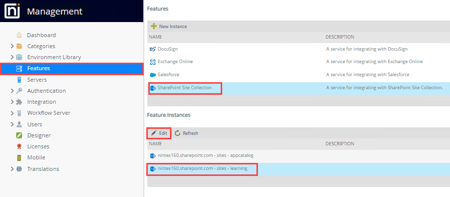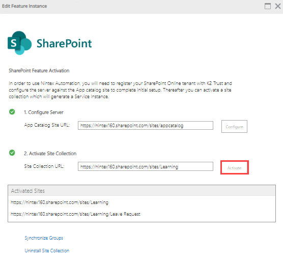 To integrate the new site collection with the product, follow the steps provided in the Configure the Feature Instance in Management section under Install the app and use the new site collection.