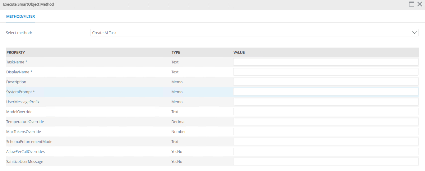 To create an AI task use the Create AI Task method in Management > Categories > System > K2 Intelligence Service > AI Task.