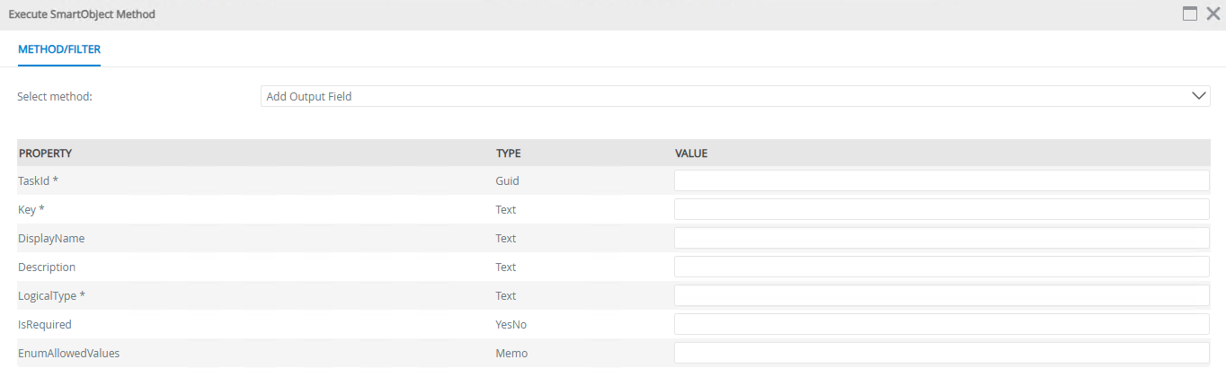 | DisplayName | A user-friendly label for the output field shown as the output name when mapping the SmartObject | No |