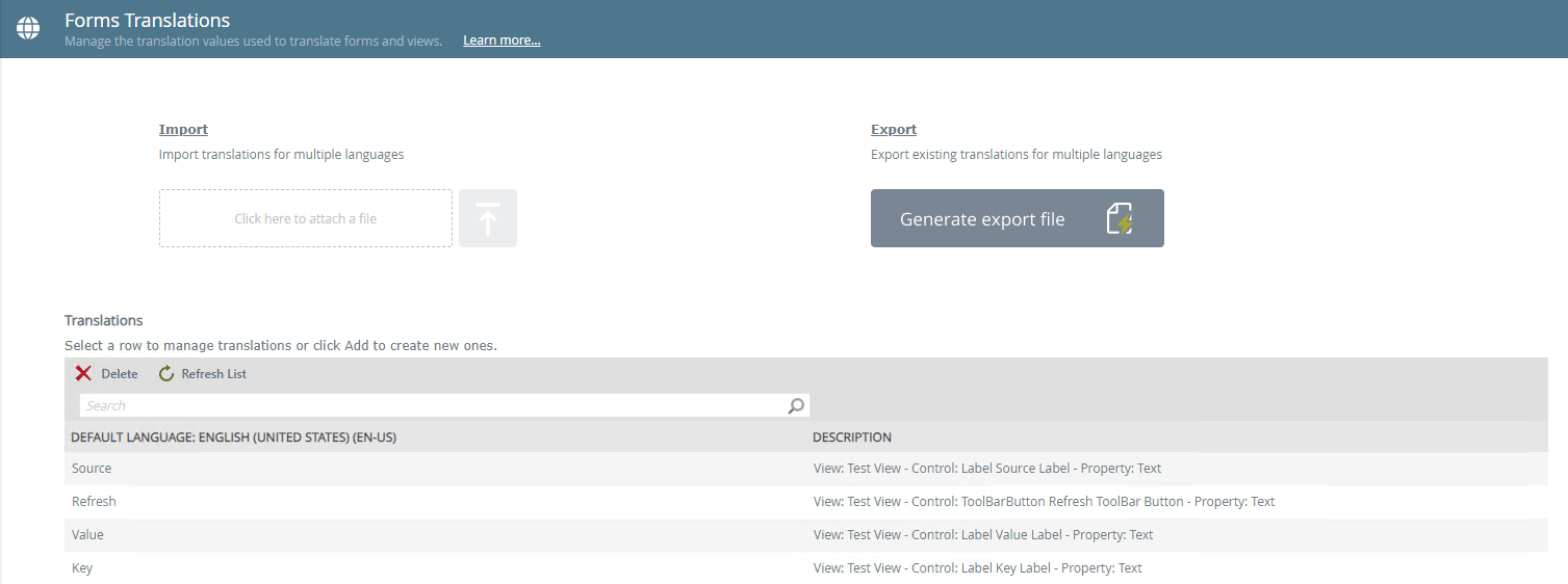 - Runtime Forms Translations - Use these settings to manage translation values for forms and views in the product.