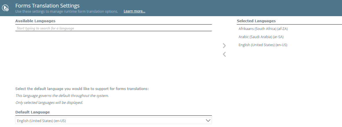 - Runtime Translation Settings - Use these settings to manage your runtime form translation options.