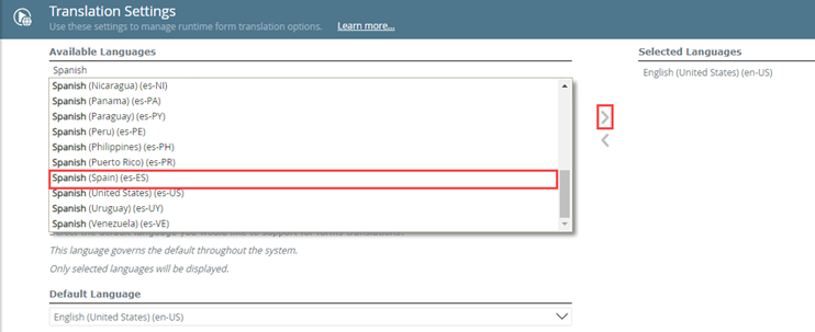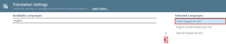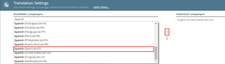- Under Available Languages search for the language you want your runtime views and forms to be translated to, then click > to add the language to the Selected Languages list. If the required language isn't returned when typing only the language, try adding the location or locale code to filter the list further.